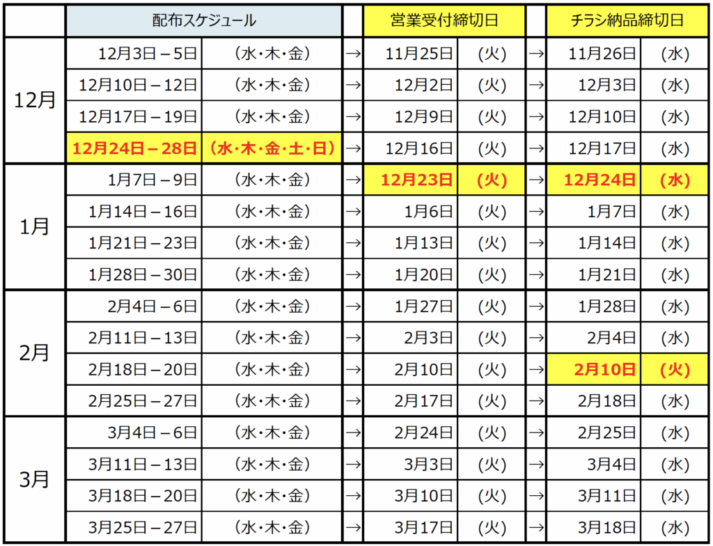 ハイコムポスティング配布スケジュールのお知らせ 【2025年12月~2026年3月】